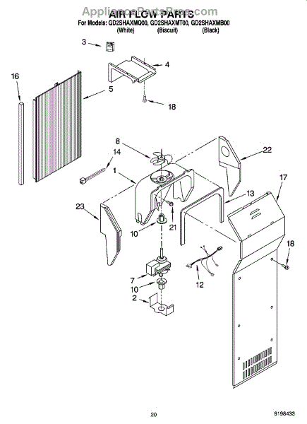 This fan scroll is the molded blower housing that directs airflow from the appliance fan for efficient cooling and ventilation. Replacing a damaged scroll restores proper air path and reduces airflow noise or performance issues. What it does