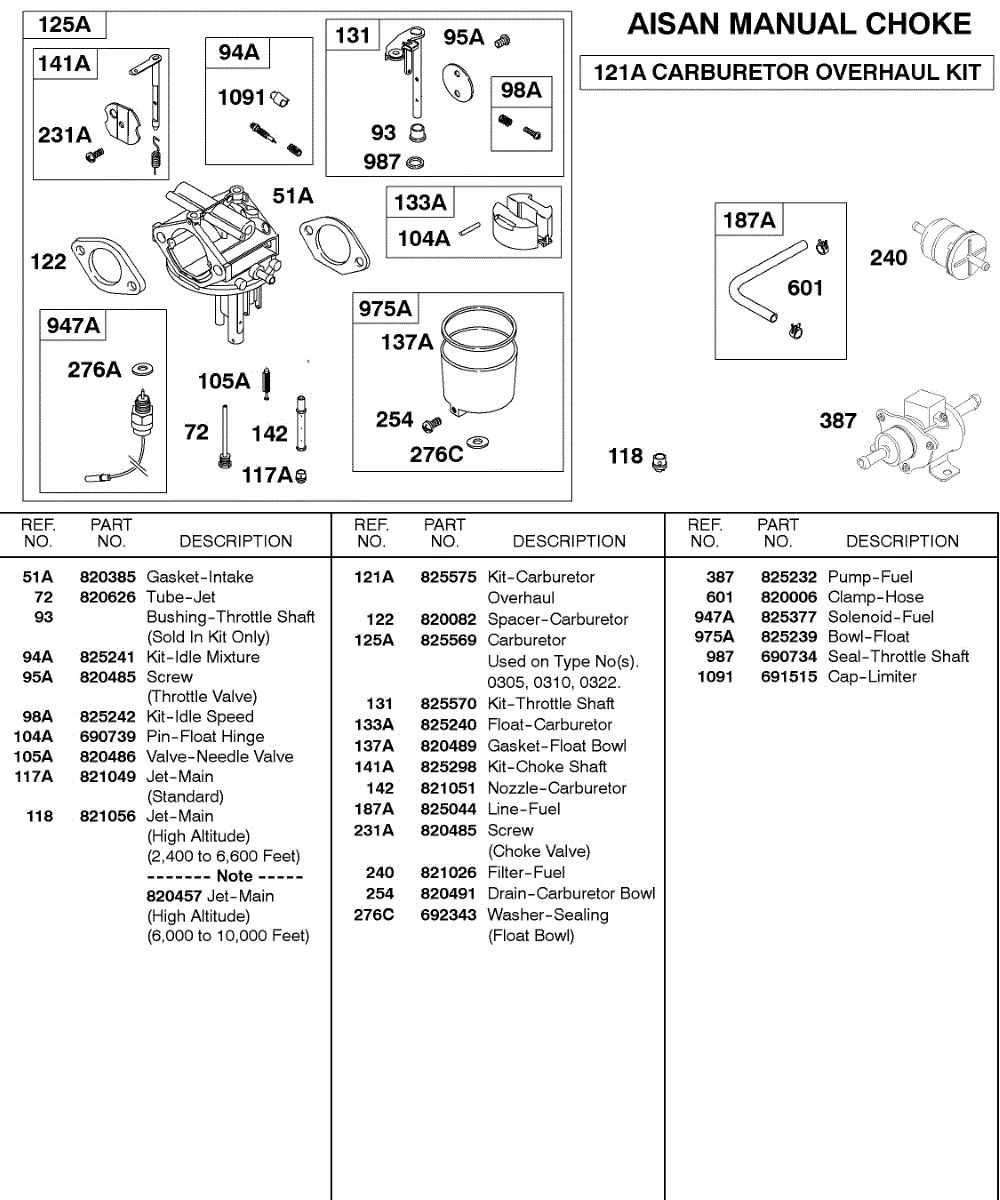 Parts for Briggs & Stratton 589447-0334-99: Aisan Manual Choke Carburetor Parts