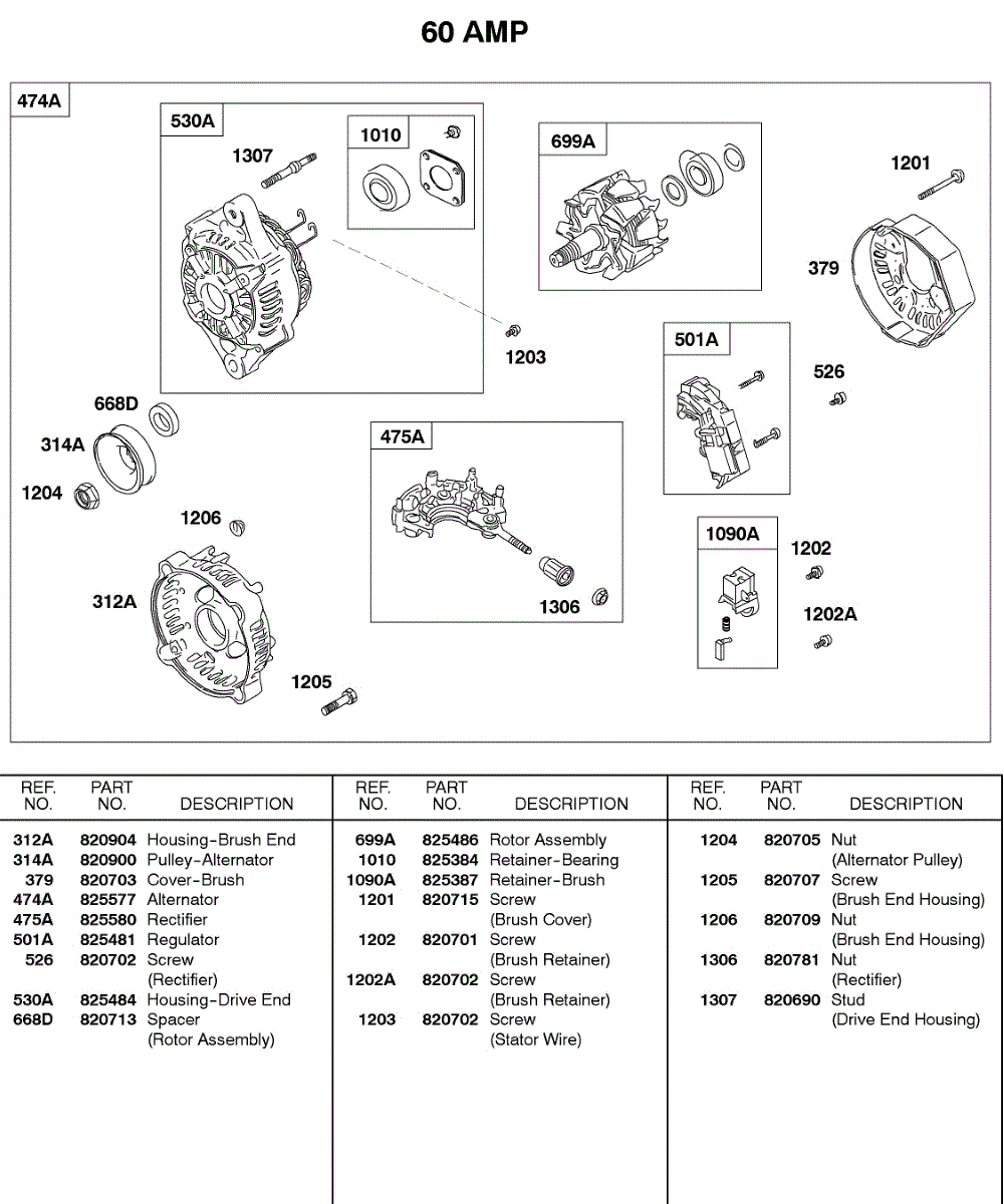 Parts for Briggs & Stratton 580447-0105-A1: Alternator, 60 Amp Parts