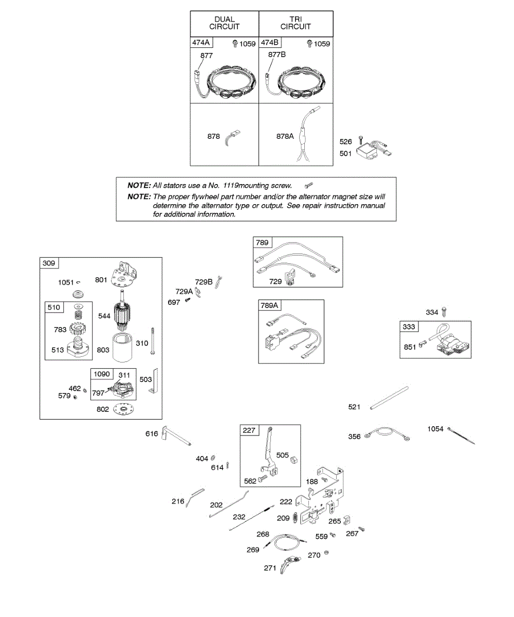 Parts for Briggs & Stratton 281H07-0111-E1: Alternator, Controls, Electric Starter, Governor Spring, Ignition Parts