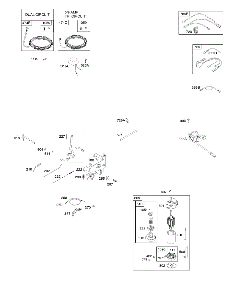 Parts for Briggs & Stratton 331977-0009-G1: Alternator, Controls, Electric Starter, Governor Spring, Ignition Parts