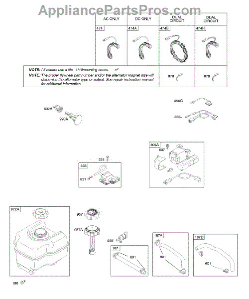 Parts for Briggs & Stratton 20C414-0206-E1: Alternator, Electric Starter, Fuel Supply, Ignition Parts