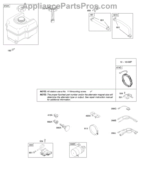 Parts for Briggs & Stratton 20E337-0110-E1: Alternator, Electric Starter, Fuel Supply, Ignition Parts