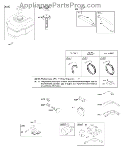 Parts for Briggs & Stratton 20F414-0112-E1: Alternator, Electric Starter, Fuel Supply, Ignition Parts
