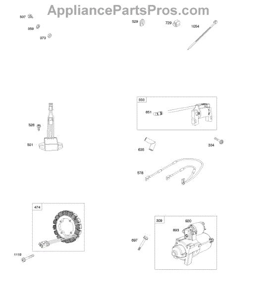 Parts for Briggs & Stratton 355447-0110-G2: Alternator, Electric Starter, Regulator, Wires Parts