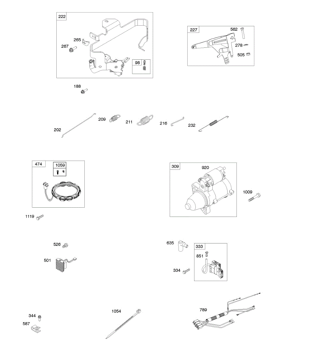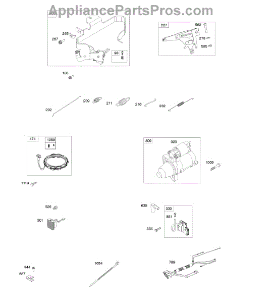 Parts for Briggs & Stratton 543577-0110-B1: Alternator, Regulator, Wires, Controls, Springs, Electric Starter Parts