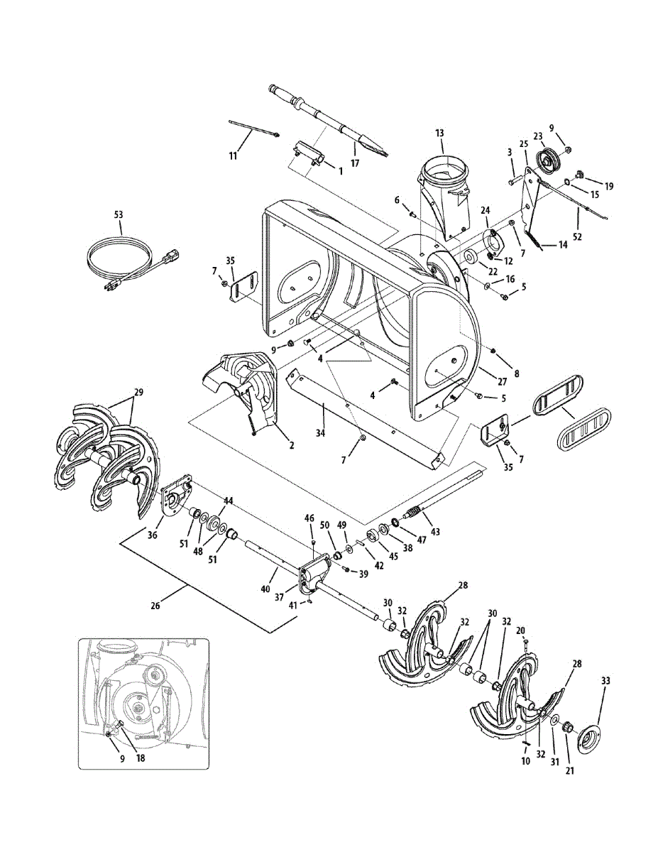 The snowblower auger cable initiates operation of the snowblower’s auger similar to the cable on the handle of a push mower. To start the snowblower, the control handle must be squeezed. This engages the snowblower auger cable to allow the auger to begin turning. When the snowblower auger cable is broken, the snowblower cannot work because the auger will not turn. The length of this snowblower auger cable is 47.48 inches. It is made from high-quality rubber insulation of a metal wire. A pair of pliers and a wrench are needed to complete the repair. If the snowblower still does not work after replacing the snowblower auger cable, check the shear pin as these are prone to breaking and will also prevent the auger from turning. This genuine OEM snowblower auger cable is compatible with snowblowers manufactured by Craftsman, Cub Cadet, Husky, MTD, Troy-Bilt, Yard Machines, and Yard-Man. This part is sold individually. You will need to order any hardware, housing, and the trigger separately if these items also need repair or replacement.