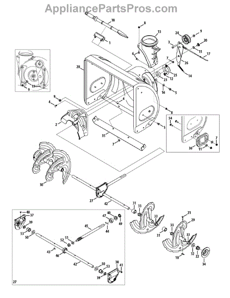 This is a left hand auger assembly that is included with many snowblowers. The auger consists of several rotating blades that collect snow and move it through the augur housing to the chute.If the auger isn't turning and the left hand assembly needs to be replaced, it will require a 3/8 inch socket, a pair of needle-nose pliers, a ½ inch socket, and a grease pump. For the replacement, remove the auger mounts and disassemble the auger shaft transmission to release the auger shaft. Remove the broken or damaged left hand auger assembly after removing any spacers and bushings. Replace the part and reassemble all of the components on the snowblower.This is an authentic OEM replacement part that is sourced directly from the manufacturer. It is sold as an individual component. The left hand auger assembly is created to be used with snowblowers made by Yard-Man, Craftsman, Huskee, Cub Cadet, MTD, Troy-Bilt, and Yard Machines.
