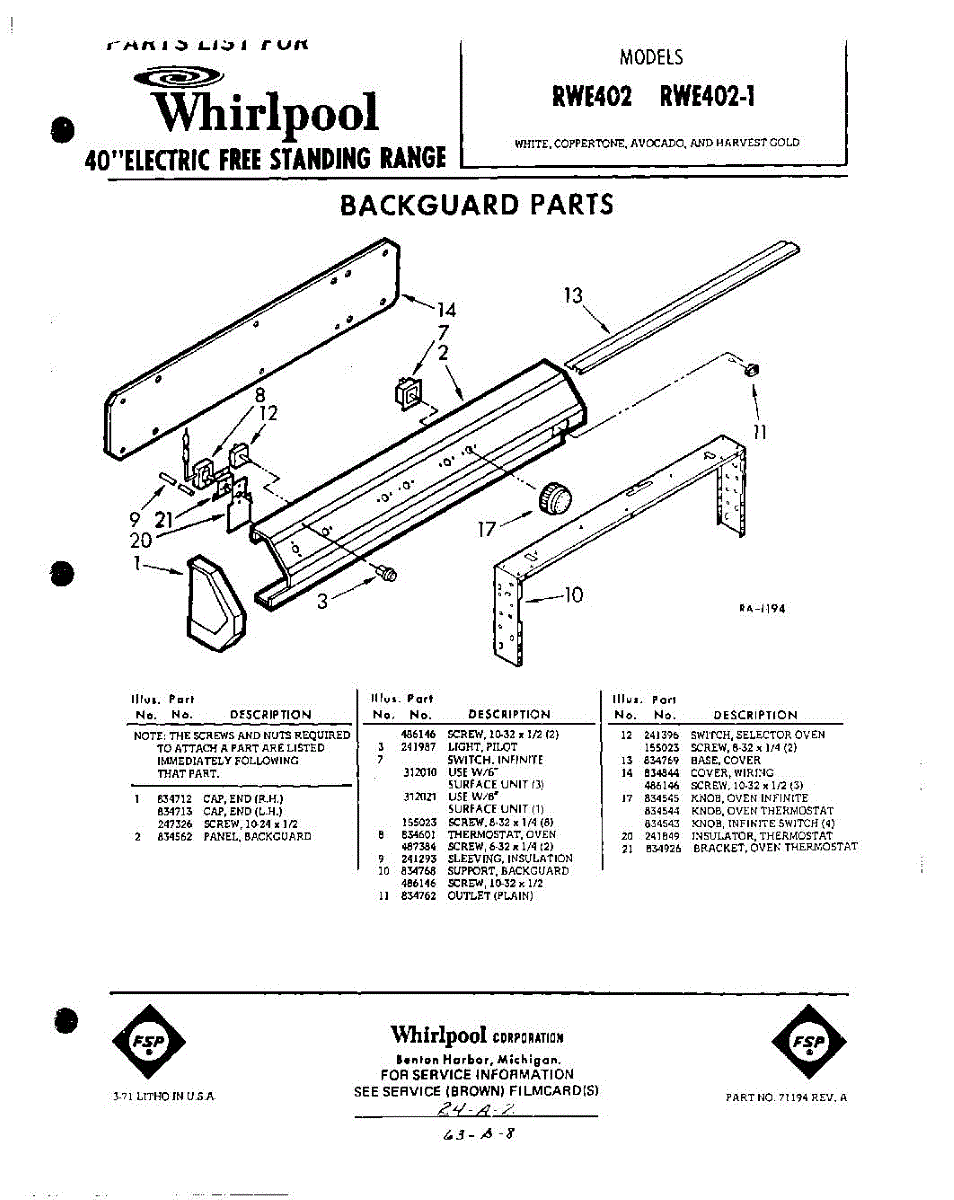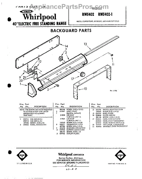 Parts for Whirlpool RWE4021: 01 - Back Guard Parts