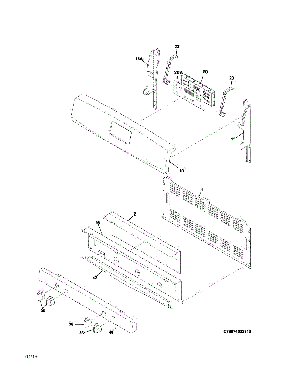 Control panel for gas ranges. Mounts on the front of the range and houses the control interface. Replace if cracked, damaged, or discolored from use.