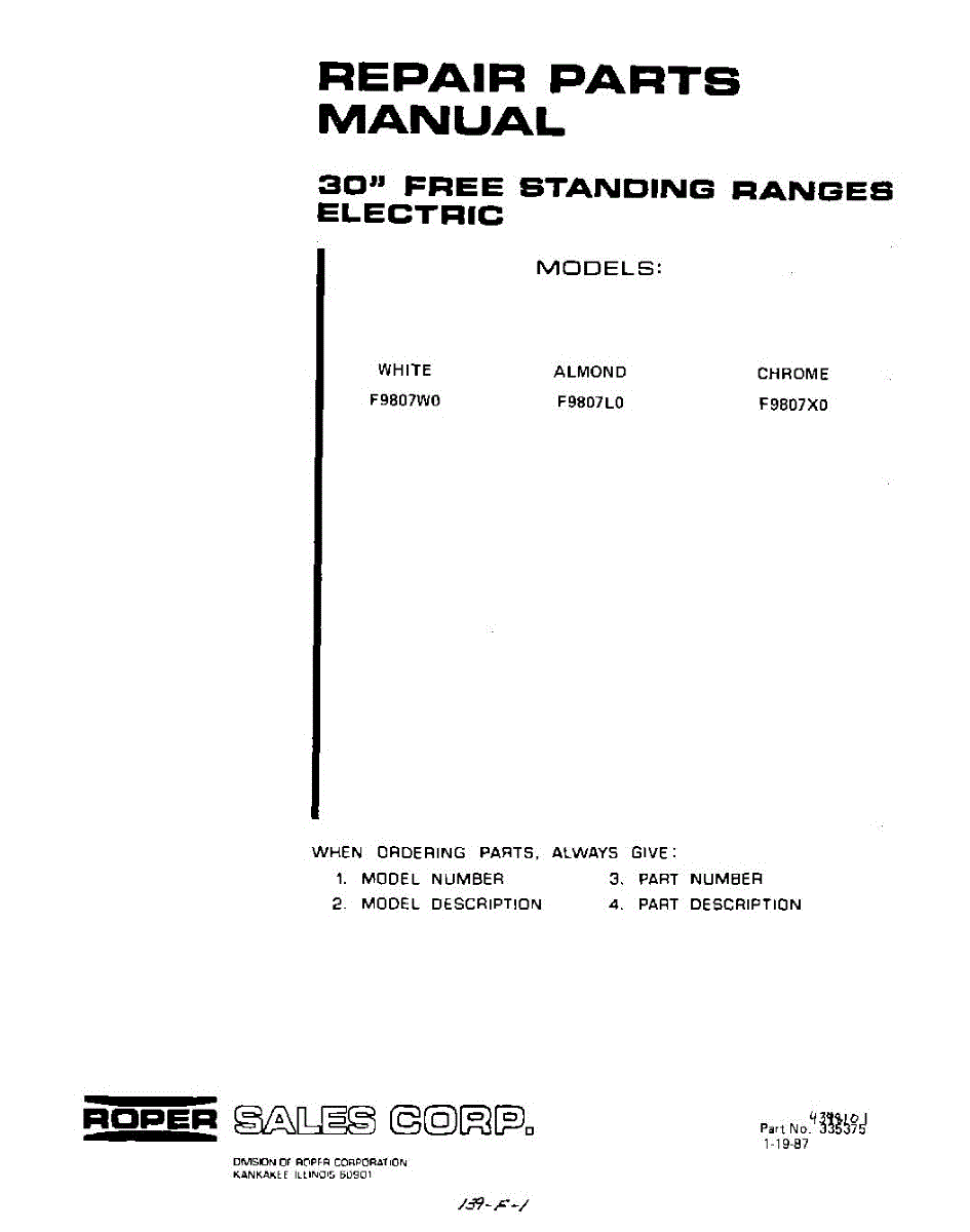 Parts for Roper F9807W0: 01 - Backguard Parts