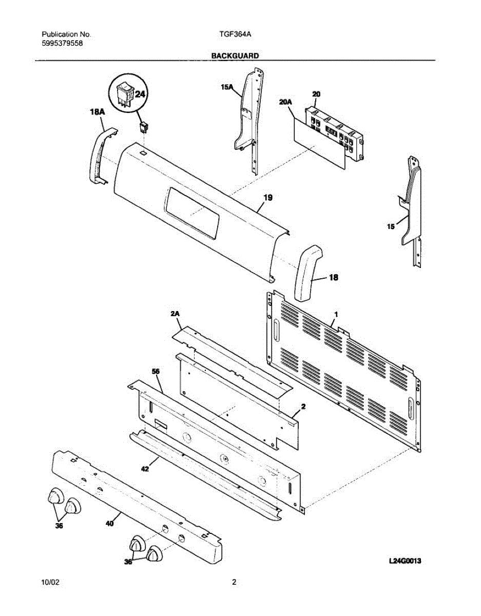 This backguard panel replaces a damaged or discolored rear console panel on compatible ranges, restoring the appliance's appearance and protecting wiring behind the control area. White finish matches factory styling. What it does: