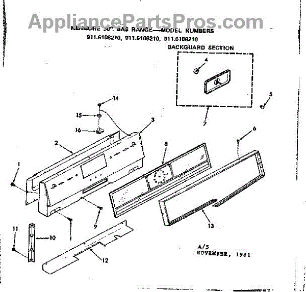 Parts for Kenmore 911.6168210 (9116168210, 911 6168210): Backguard Section Parts