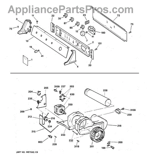 The Blower Wheel is an OEM replacement part for GE dryers. It has a role in the air circulation within the dryer, aiding in the even and efficient drying of clothes. The blower wheel, connected to the motor, helps in expelling the moist air out of the dryer through the exhaust vent during the drying cycle. Causes of a malfunctioning blower wheel are typically wear and tear from regular use, the accumulation of lint or debris, or damage to the wheel’s fins or central hub, which can impact its rotation and air circulation capability. Symptoms of a bad Blower Wheel include: