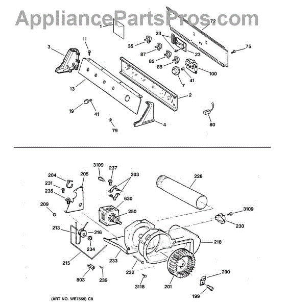 The Blower Wheel is an OEM replacement part for GE dryers. It has a role in the air circulation within the dryer, aiding in the even and efficient drying of clothes. The blower wheel, connected to the motor, helps in expelling the moist air out of the dryer through the exhaust vent during the drying cycle. Causes of a malfunctioning blower wheel are typically wear and tear from regular use, the accumulation of lint or debris, or damage to the wheel’s fins or central hub, which can impact its rotation and air circulation capability. Symptoms of a bad Blower Wheel include: