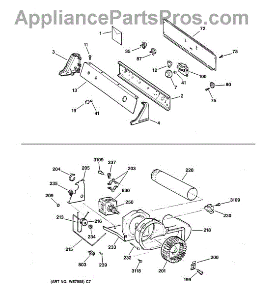 The Blower Wheel is an OEM replacement part for GE dryers. It has a role in the air circulation within the dryer, aiding in the even and efficient drying of clothes. The blower wheel, connected to the motor, helps in expelling the moist air out of the dryer through the exhaust vent during the drying cycle. Causes of a malfunctioning blower wheel are typically wear and tear from regular use, the accumulation of lint or debris, or damage to the wheel’s fins or central hub, which can impact its rotation and air circulation capability. Symptoms of a bad Blower Wheel include: