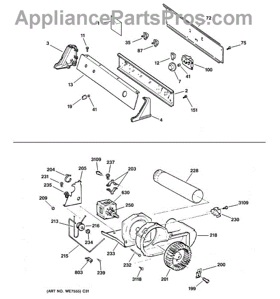 The Blower Wheel is an OEM replacement part for GE dryers. It has a role in the air circulation within the dryer, aiding in the even and efficient drying of clothes. The blower wheel, connected to the motor, helps in expelling the moist air out of the dryer through the exhaust vent during the drying cycle. Causes of a malfunctioning blower wheel are typically wear and tear from regular use, the accumulation of lint or debris, or damage to the wheel’s fins or central hub, which can impact its rotation and air circulation capability. Symptoms of a bad Blower Wheel include: