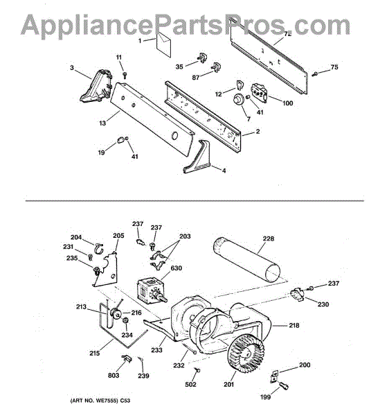 The Blower Wheel is an OEM replacement part for GE dryers. It has a role in the air circulation within the dryer, aiding in the even and efficient drying of clothes. The blower wheel, connected to the motor, helps in expelling the moist air out of the dryer through the exhaust vent during the drying cycle. Causes of a malfunctioning blower wheel are typically wear and tear from regular use, the accumulation of lint or debris, or damage to the wheel’s fins or central hub, which can impact its rotation and air circulation capability. Symptoms of a bad Blower Wheel include: