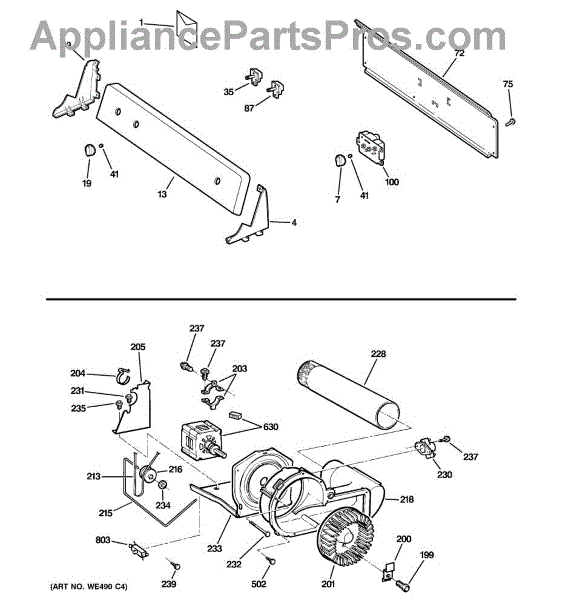 The Blower Wheel is an OEM replacement part for GE dryers. It has a role in the air circulation within the dryer, aiding in the even and efficient drying of clothes. The blower wheel, connected to the motor, helps in expelling the moist air out of the dryer through the exhaust vent during the drying cycle. Causes of a malfunctioning blower wheel are typically wear and tear from regular use, the accumulation of lint or debris, or damage to the wheel’s fins or central hub, which can impact its rotation and air circulation capability. Symptoms of a bad Blower Wheel include: