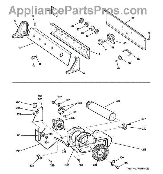 The Blower Wheel is an OEM replacement part for GE dryers. It has a role in the air circulation within the dryer, aiding in the even and efficient drying of clothes. The blower wheel, connected to the motor, helps in expelling the moist air out of the dryer through the exhaust vent during the drying cycle. Causes of a malfunctioning blower wheel are typically wear and tear from regular use, the accumulation of lint or debris, or damage to the wheel’s fins or central hub, which can impact its rotation and air circulation capability. Symptoms of a bad Blower Wheel include: