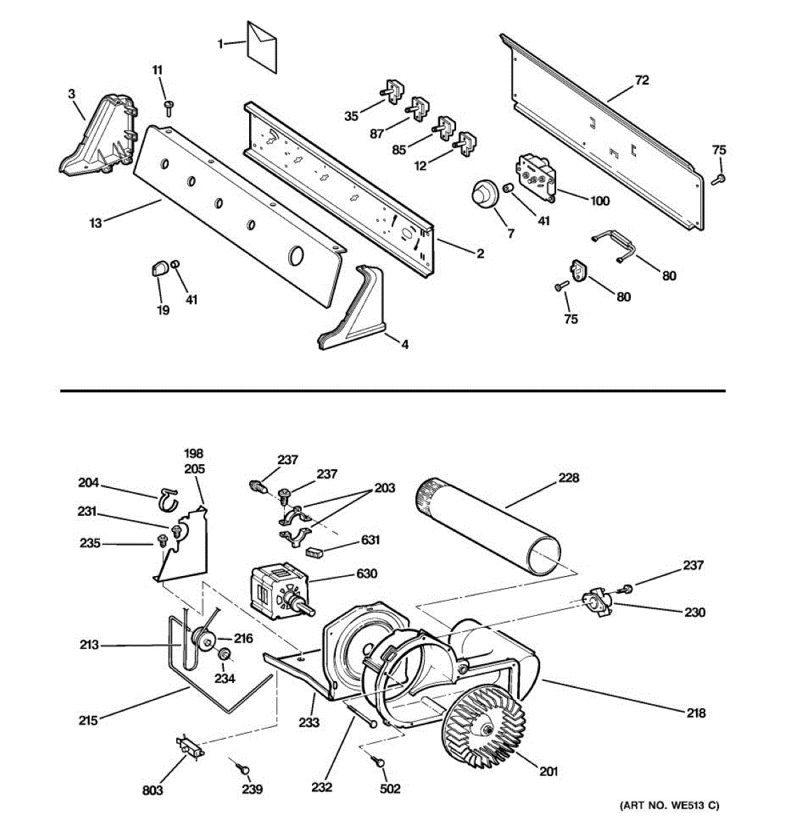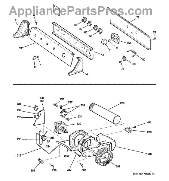 The Blower Wheel is an OEM replacement part for GE dryers. It has a role in the air circulation within the dryer, aiding in the even and efficient drying of clothes. The blower wheel, connected to the motor, helps in expelling the moist air out of the dryer through the exhaust vent during the drying cycle. Causes of a malfunctioning blower wheel are typically wear and tear from regular use, the accumulation of lint or debris, or damage to the wheel’s fins or central hub, which can impact its rotation and air circulation capability. Symptoms of a bad Blower Wheel include: