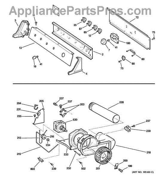 The Blower Wheel is an OEM replacement part for GE dryers. It has a role in the air circulation within the dryer, aiding in the even and efficient drying of clothes. The blower wheel, connected to the motor, helps in expelling the moist air out of the dryer through the exhaust vent during the drying cycle. Causes of a malfunctioning blower wheel are typically wear and tear from regular use, the accumulation of lint or debris, or damage to the wheel’s fins or central hub, which can impact its rotation and air circulation capability. Symptoms of a bad Blower Wheel include: