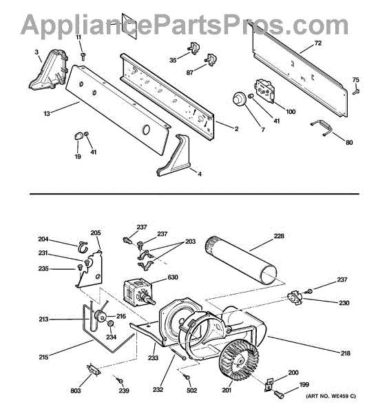 The Blower Wheel is an OEM replacement part for GE dryers. It has a role in the air circulation within the dryer, aiding in the even and efficient drying of clothes. The blower wheel, connected to the motor, helps in expelling the moist air out of the dryer through the exhaust vent during the drying cycle. Causes of a malfunctioning blower wheel are typically wear and tear from regular use, the accumulation of lint or debris, or damage to the wheel’s fins or central hub, which can impact its rotation and air circulation capability. Symptoms of a bad Blower Wheel include: