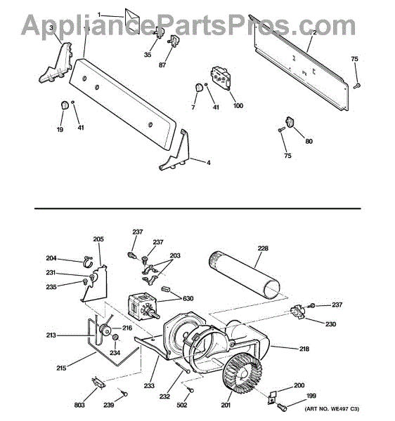 The Blower Wheel is an OEM replacement part for GE dryers. It has a role in the air circulation within the dryer, aiding in the even and efficient drying of clothes. The blower wheel, connected to the motor, helps in expelling the moist air out of the dryer through the exhaust vent during the drying cycle. Causes of a malfunctioning blower wheel are typically wear and tear from regular use, the accumulation of lint or debris, or damage to the wheel’s fins or central hub, which can impact its rotation and air circulation capability. Symptoms of a bad Blower Wheel include: