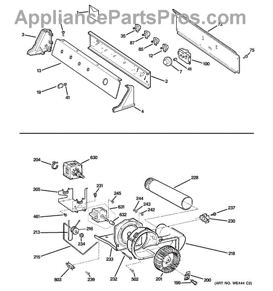 The Blower Wheel is an OEM replacement part for GE dryers. It has a role in the air circulation within the dryer, aiding in the even and efficient drying of clothes. The blower wheel, connected to the motor, helps in expelling the moist air out of the dryer through the exhaust vent during the drying cycle. Causes of a malfunctioning blower wheel are typically wear and tear from regular use, the accumulation of lint or debris, or damage to the wheel’s fins or central hub, which can impact its rotation and air circulation capability. Symptoms of a bad Blower Wheel include: