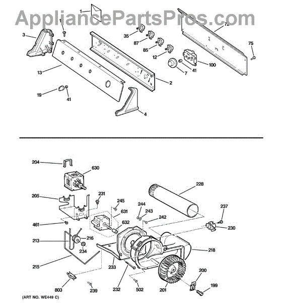 The Blower Wheel is an OEM replacement part for GE dryers. It has a role in the air circulation within the dryer, aiding in the even and efficient drying of clothes. The blower wheel, connected to the motor, helps in expelling the moist air out of the dryer through the exhaust vent during the drying cycle. Causes of a malfunctioning blower wheel are typically wear and tear from regular use, the accumulation of lint or debris, or damage to the wheel’s fins or central hub, which can impact its rotation and air circulation capability. Symptoms of a bad Blower Wheel include:
