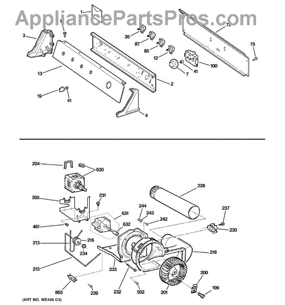 The Blower Wheel is an OEM replacement part for GE dryers. It has a role in the air circulation within the dryer, aiding in the even and efficient drying of clothes. The blower wheel, connected to the motor, helps in expelling the moist air out of the dryer through the exhaust vent during the drying cycle. Causes of a malfunctioning blower wheel are typically wear and tear from regular use, the accumulation of lint or debris, or damage to the wheel’s fins or central hub, which can impact its rotation and air circulation capability. Symptoms of a bad Blower Wheel include: