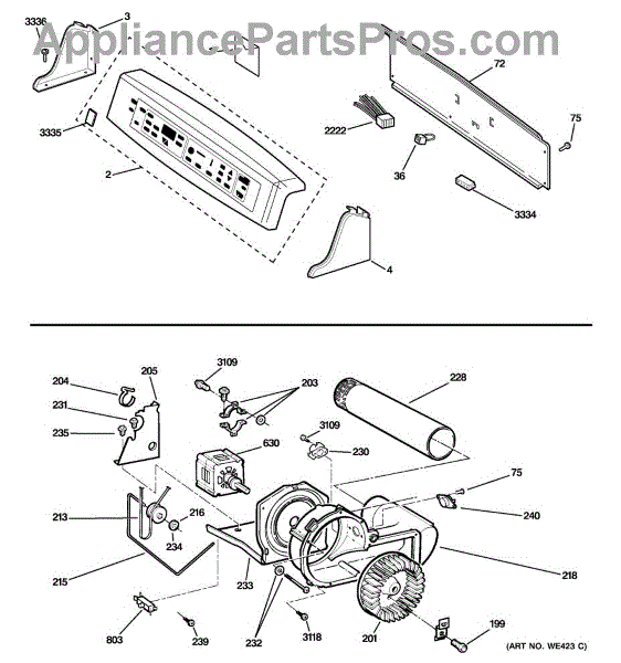 The Blower Wheel is an OEM replacement part for GE dryers. It has a role in the air circulation within the dryer, aiding in the even and efficient drying of clothes. The blower wheel, connected to the motor, helps in expelling the moist air out of the dryer through the exhaust vent during the drying cycle. Causes of a malfunctioning blower wheel are typically wear and tear from regular use, the accumulation of lint or debris, or damage to the wheel’s fins or central hub, which can impact its rotation and air circulation capability. Symptoms of a bad Blower Wheel include: