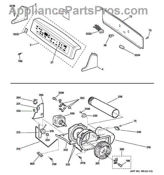 The Blower Wheel is an OEM replacement part for GE dryers. It has a role in the air circulation within the dryer, aiding in the even and efficient drying of clothes. The blower wheel, connected to the motor, helps in expelling the moist air out of the dryer through the exhaust vent during the drying cycle. Causes of a malfunctioning blower wheel are typically wear and tear from regular use, the accumulation of lint or debris, or damage to the wheel’s fins or central hub, which can impact its rotation and air circulation capability. Symptoms of a bad Blower Wheel include: