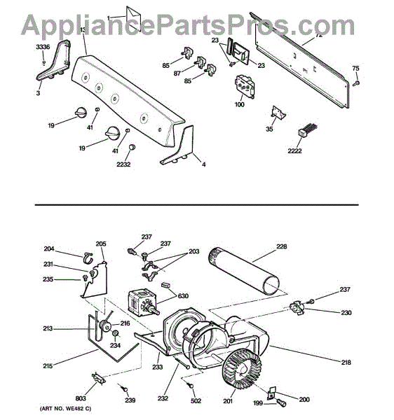 The Blower Wheel is an OEM replacement part for GE dryers. It has a role in the air circulation within the dryer, aiding in the even and efficient drying of clothes. The blower wheel, connected to the motor, helps in expelling the moist air out of the dryer through the exhaust vent during the drying cycle. Causes of a malfunctioning blower wheel are typically wear and tear from regular use, the accumulation of lint or debris, or damage to the wheel’s fins or central hub, which can impact its rotation and air circulation capability. Symptoms of a bad Blower Wheel include: