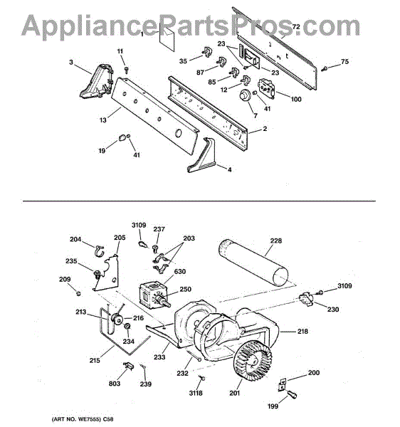 The Blower Wheel is an OEM replacement part for GE dryers. It has a role in the air circulation within the dryer, aiding in the even and efficient drying of clothes. The blower wheel, connected to the motor, helps in expelling the moist air out of the dryer through the exhaust vent during the drying cycle. Causes of a malfunctioning blower wheel are typically wear and tear from regular use, the accumulation of lint or debris, or damage to the wheel’s fins or central hub, which can impact its rotation and air circulation capability. Symptoms of a bad Blower Wheel include: