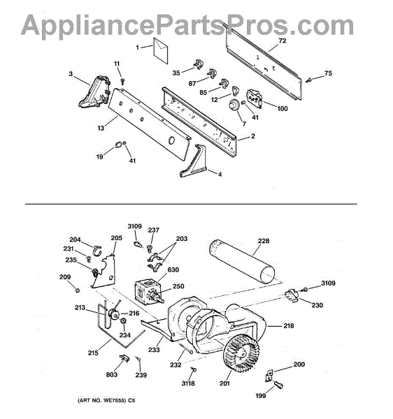The Blower Wheel is an OEM replacement part for GE dryers. It has a role in the air circulation within the dryer, aiding in the even and efficient drying of clothes. The blower wheel, connected to the motor, helps in expelling the moist air out of the dryer through the exhaust vent during the drying cycle. Causes of a malfunctioning blower wheel are typically wear and tear from regular use, the accumulation of lint or debris, or damage to the wheel’s fins or central hub, which can impact its rotation and air circulation capability. Symptoms of a bad Blower Wheel include: