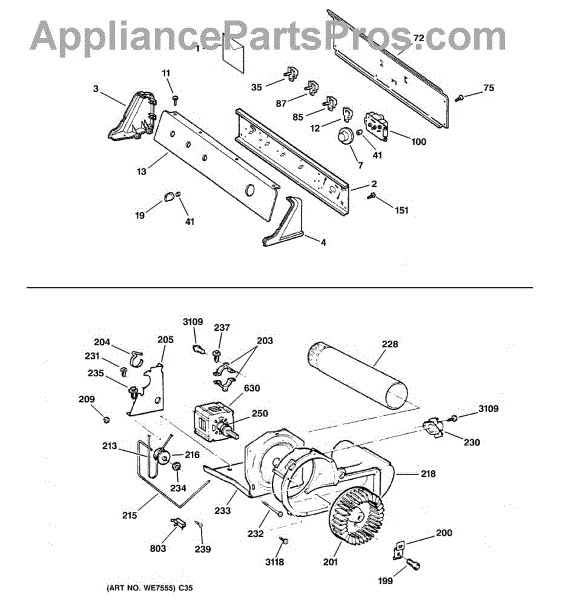 The Blower Wheel is an OEM replacement part for GE dryers. It has a role in the air circulation within the dryer, aiding in the even and efficient drying of clothes. The blower wheel, connected to the motor, helps in expelling the moist air out of the dryer through the exhaust vent during the drying cycle. Causes of a malfunctioning blower wheel are typically wear and tear from regular use, the accumulation of lint or debris, or damage to the wheel’s fins or central hub, which can impact its rotation and air circulation capability. Symptoms of a bad Blower Wheel include: