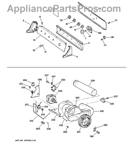 The Blower Wheel is an OEM replacement part for GE dryers. It has a role in the air circulation within the dryer, aiding in the even and efficient drying of clothes. The blower wheel, connected to the motor, helps in expelling the moist air out of the dryer through the exhaust vent during the drying cycle. Causes of a malfunctioning blower wheel are typically wear and tear from regular use, the accumulation of lint or debris, or damage to the wheel’s fins or central hub, which can impact its rotation and air circulation capability. Symptoms of a bad Blower Wheel include: