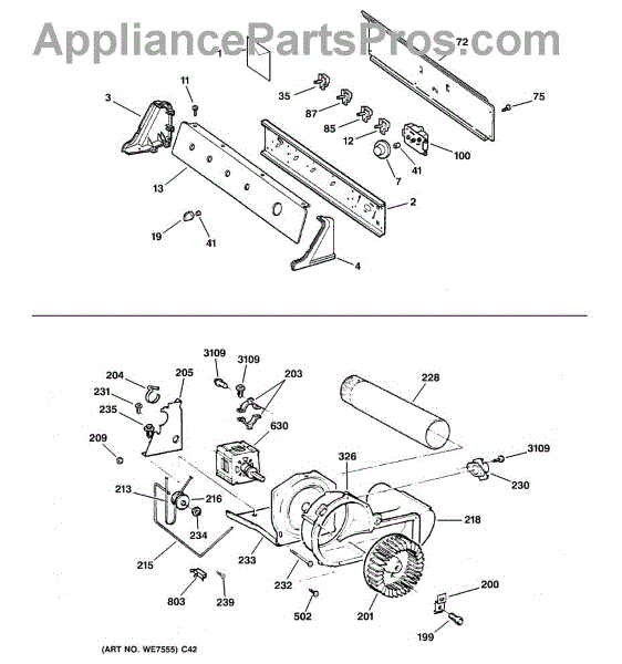 The Blower Wheel is an OEM replacement part for GE dryers. It has a role in the air circulation within the dryer, aiding in the even and efficient drying of clothes. The blower wheel, connected to the motor, helps in expelling the moist air out of the dryer through the exhaust vent during the drying cycle. Causes of a malfunctioning blower wheel are typically wear and tear from regular use, the accumulation of lint or debris, or damage to the wheel’s fins or central hub, which can impact its rotation and air circulation capability. Symptoms of a bad Blower Wheel include: