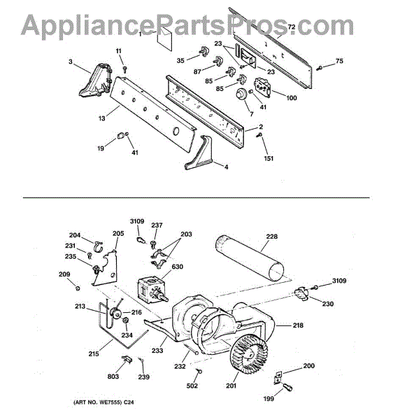 The Blower Wheel is an OEM replacement part for GE dryers. It has a role in the air circulation within the dryer, aiding in the even and efficient drying of clothes. The blower wheel, connected to the motor, helps in expelling the moist air out of the dryer through the exhaust vent during the drying cycle. Causes of a malfunctioning blower wheel are typically wear and tear from regular use, the accumulation of lint or debris, or damage to the wheel’s fins or central hub, which can impact its rotation and air circulation capability. Symptoms of a bad Blower Wheel include:
