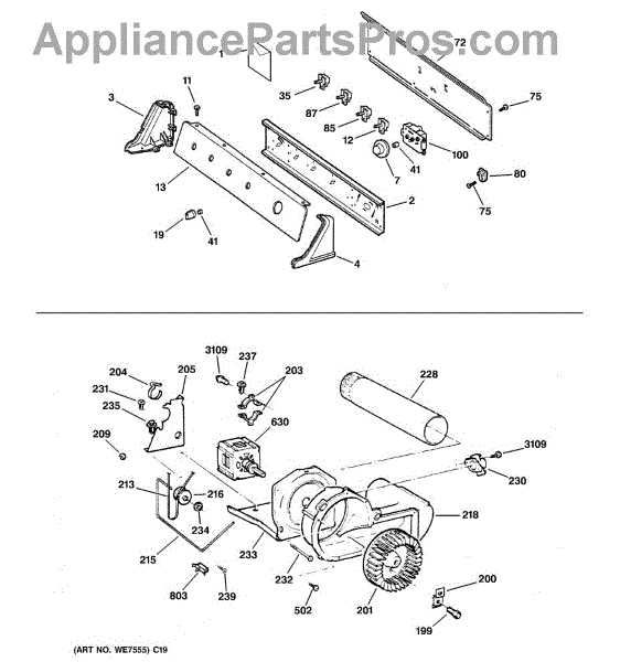 The Blower Wheel is an OEM replacement part for GE dryers. It has a role in the air circulation within the dryer, aiding in the even and efficient drying of clothes. The blower wheel, connected to the motor, helps in expelling the moist air out of the dryer through the exhaust vent during the drying cycle. Causes of a malfunctioning blower wheel are typically wear and tear from regular use, the accumulation of lint or debris, or damage to the wheel’s fins or central hub, which can impact its rotation and air circulation capability. Symptoms of a bad Blower Wheel include: