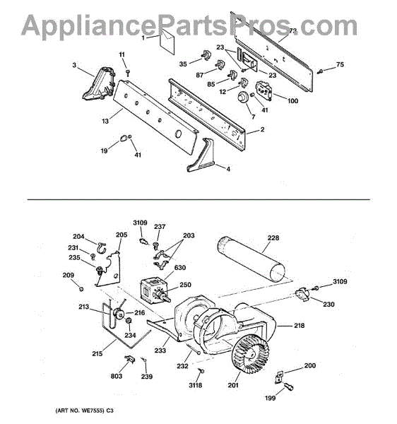 The Blower Wheel is an OEM replacement part for GE dryers. It has a role in the air circulation within the dryer, aiding in the even and efficient drying of clothes. The blower wheel, connected to the motor, helps in expelling the moist air out of the dryer through the exhaust vent during the drying cycle. Causes of a malfunctioning blower wheel are typically wear and tear from regular use, the accumulation of lint or debris, or damage to the wheel’s fins or central hub, which can impact its rotation and air circulation capability. Symptoms of a bad Blower Wheel include: