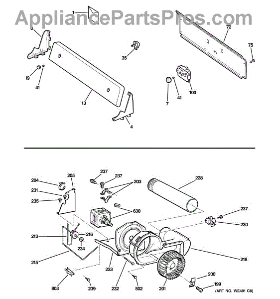 The Blower Wheel is an OEM replacement part for GE dryers. It has a role in the air circulation within the dryer, aiding in the even and efficient drying of clothes. The blower wheel, connected to the motor, helps in expelling the moist air out of the dryer through the exhaust vent during the drying cycle. Causes of a malfunctioning blower wheel are typically wear and tear from regular use, the accumulation of lint or debris, or damage to the wheel’s fins or central hub, which can impact its rotation and air circulation capability. Symptoms of a bad Blower Wheel include: