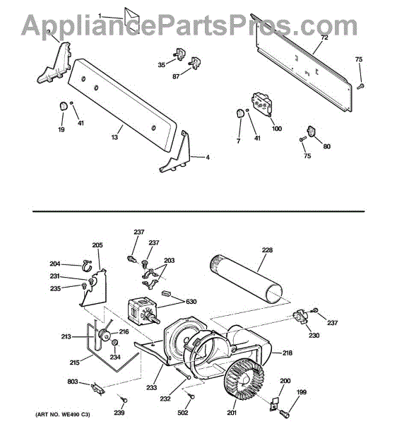 The Blower Wheel is an OEM replacement part for GE dryers. It has a role in the air circulation within the dryer, aiding in the even and efficient drying of clothes. The blower wheel, connected to the motor, helps in expelling the moist air out of the dryer through the exhaust vent during the drying cycle. Causes of a malfunctioning blower wheel are typically wear and tear from regular use, the accumulation of lint or debris, or damage to the wheel’s fins or central hub, which can impact its rotation and air circulation capability. Symptoms of a bad Blower Wheel include: