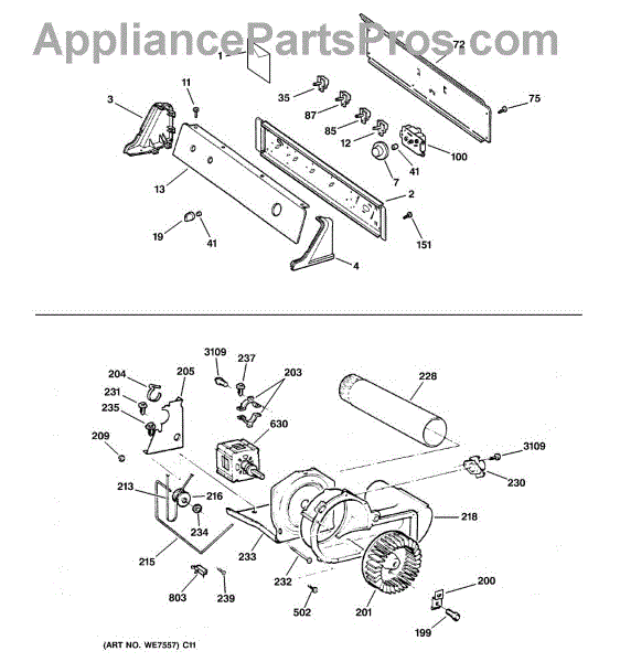 The Blower Wheel is an OEM replacement part for GE dryers. It has a role in the air circulation within the dryer, aiding in the even and efficient drying of clothes. The blower wheel, connected to the motor, helps in expelling the moist air out of the dryer through the exhaust vent during the drying cycle. Causes of a malfunctioning blower wheel are typically wear and tear from regular use, the accumulation of lint or debris, or damage to the wheel’s fins or central hub, which can impact its rotation and air circulation capability. Symptoms of a bad Blower Wheel include:
