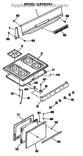 Parts for Ge JLBS03PK4: Backsplash / Cooktop / Door Assembly Parts
