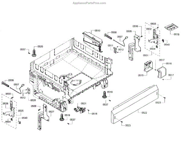 The Base Panel is an OEM part for Bosch dishwashers. It serves as a protective cover for the bottom of the dishwasher, shielding internal components from debris, moisture, and damage while also contributing to the appliance's structural stability.