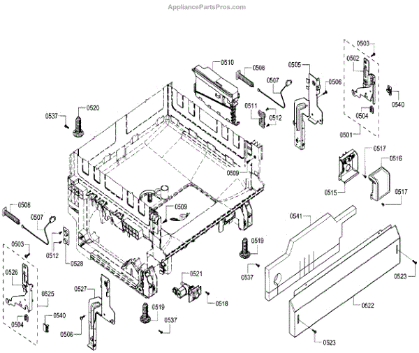 The Base Panel is an OEM part for Bosch dishwashers. It serves as a protective cover for the bottom of the dishwasher, shielding internal components from debris, moisture, and damage while also contributing to the appliance's structural stability.