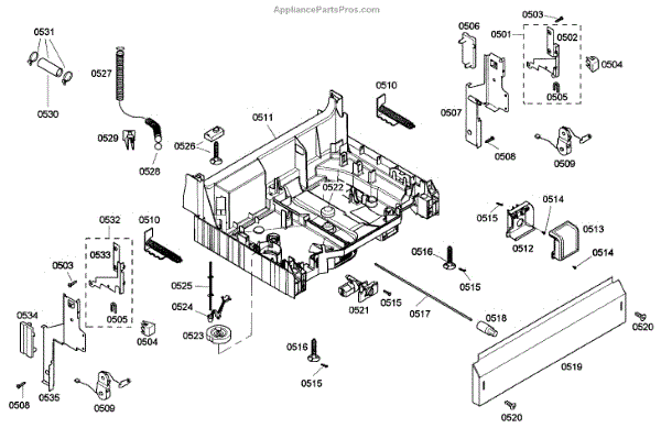 The Base Panel is an OEM part for Bosch dishwashers. It serves as a protective cover for the bottom of the dishwasher, shielding internal components from debris, moisture, and damage while also contributing to the appliance's structural stability.