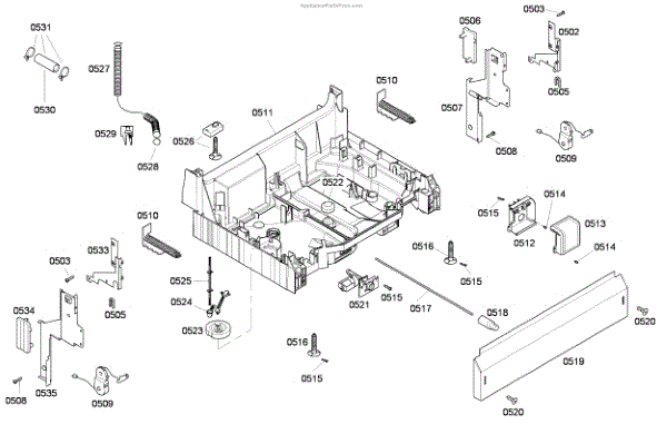 The Base Panel is an OEM part for Bosch dishwashers. It serves as a protective cover for the bottom of the dishwasher, shielding internal components from debris, moisture, and damage while also contributing to the appliance's structural stability.